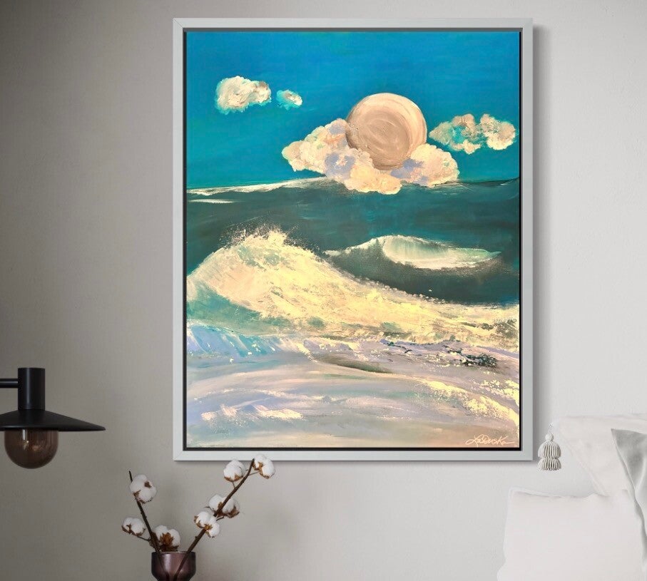 "Mood in Blue" drifts between stillness and motion, where the ociean breathes in layered rhythms. In the distance, a lone wave rises like a quiet thought on the horizon, while nearer waters gather energy--rolling, shifting, and finally surrendering as they breatk along the shore. Above it all, the moon glows softly through passing clouds, casting a hush over the scene. There's a sense of depth not just in the water, but in the atmoshphere itself--a calm tension between distance and immediacy, like emotion unfolding in slow, steady waves.