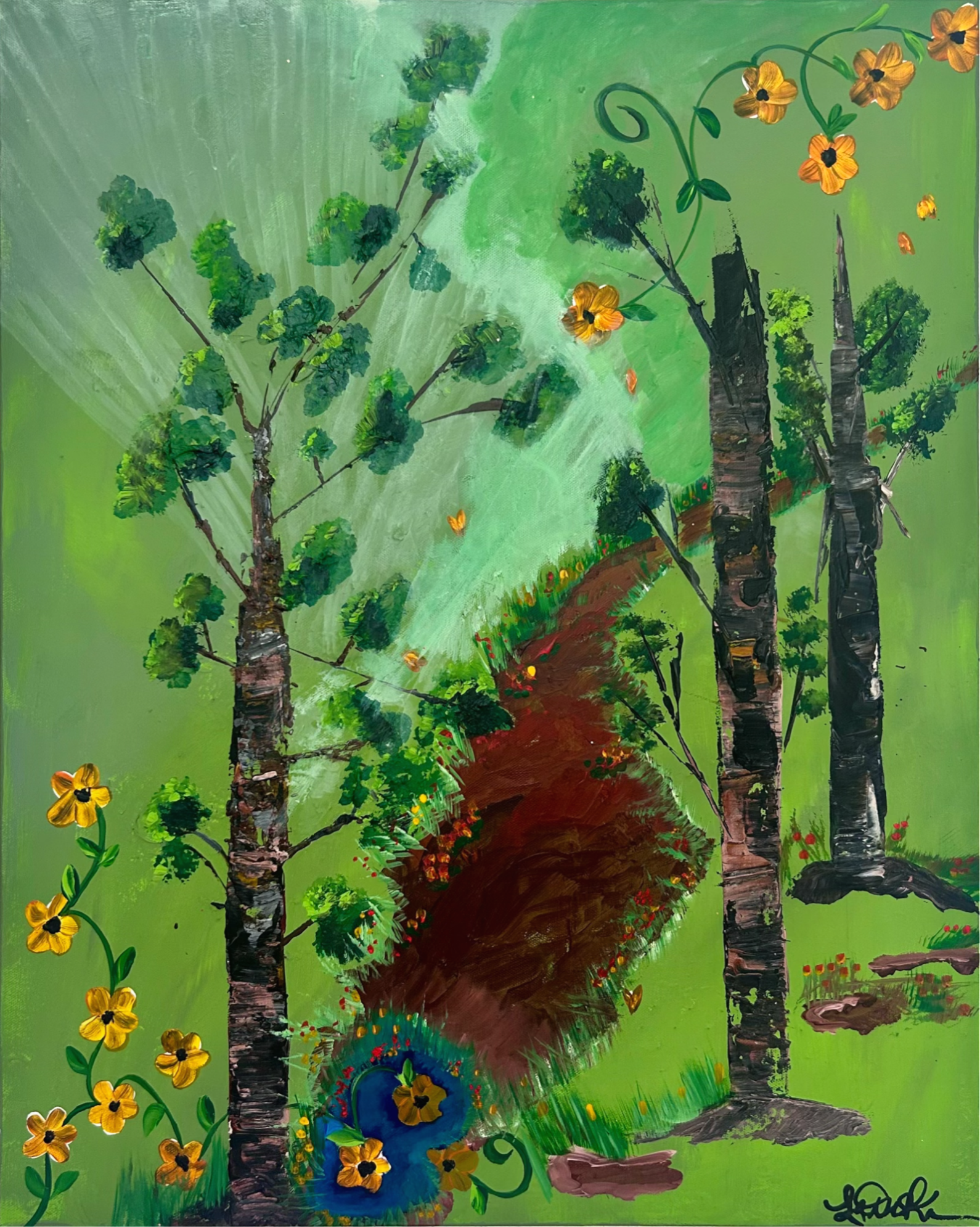 This print of Winter Sun's Light captures a quiet, luminous moment as soft light spills from the top left, filtering through tall, watchful trees. A gentle path winds into the distance, bordered by delicate flowers, while the surrounding green breathes calm and stillness—an intimate landscape where even winter feels quietly alive. The original painting was sold. Prints are available for $42 16x20" signed on acid-free, archival paper.